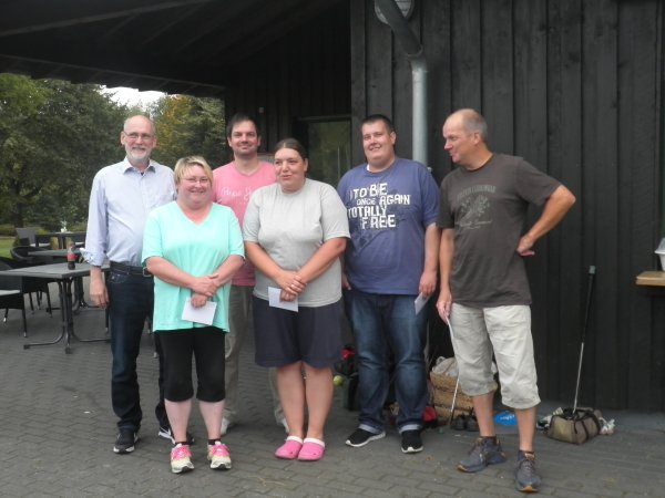 Die Sieger des Sommer-Cups 2016: Ansgar Buchholz (1.v.re.), Marcus Rade (3.v.li.), Stephan Behrens (2.v.re.), Melanie Wickel-Paffrath (3.v.re.), Nicole Lieber (2.v.li.), Michael Puschner (1.v.li.) ![]() Am letzten Spieltag des Sommer-Cups wurde es richtig spannend - drei der 23 Starter hatten noch Chancen auf den Gesamtsieg. Und es blieb auch bis zum Schluss knapp: Stephan Behrens spielte zweimal 29 und lag damit vor Marcus Rade, dem in seiner schlechteren Runde nur eine 33 gelang. Nun war die Situation so, dass tatsächlich noch alle drei Spieler - Stephan Behrens, Marcus Rade und Ansgar Buchholz in der Gesamtwertung punktgleich gewesen wären, wenn Ansgar in der letzten eine 30 gespielt hätte. Hätte, hätte ... hat er aber nicht: Mit dem letzten Schlag des Tages, einem As an Bahn 18 stand die 28 für Ansgar auf dem Spielprotokoll und damit der geteilte Tagessieg mit Melanie Wickel-Paffrath und Volker Urban. Damit sicherte sich Ansgar den Gesamtsieg mit 223 Punkten und da Stephans 29 nur zu Platz 4 in der Tageswertung reichte, blieb Marcus Rade (213) dann doch knapp Zweiter vor Stephan Behrens (210). Melanie Wickel-Paffrath (151 Punkte) sicherte sich den vierten Platz in der Gesamtwertung vor den punktgleichen Phillipp Lange und Volker Urban. Da diese beiden Spieler aber zuwenig Starts haben, um sich für einen der Geldpreise zu qualifizieren, mussten am nächsten Donnerstag (1.9.) die beiden in der Gesamtwertung nächsten Teilnehmer - Nicole Lieber und Michael Puschner - um die Preise 5 und 6 stechen. Dieses Stechen gewann Nicole Lieber durch ein As an Bahn 1. Das parallel stattfindende Abschlussgrillen war ein netter Schlussstrich unter dem Sommer-Cup 2016. Lasst Euch überraschen, wie der Austragungsmodus 2017 wird ... Alle Ergebnisse |