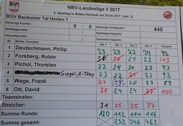 Winterpokal 2016/2017 - Bericht vom 12. Spieltag Bei wunderschönem Wetter, aber in der ersten Runde noch feuchten Bahnen, traten 28 Starter beim heutigen Spieltag an. Insgesamt wurden heute etwas weniger Asse gemacht als sonst, das Einschätzen des Tempos war nicht ganz einfach. Am besten kam mit den Bedingungen Dirk Mühling zurecht, der nicht nur in jeder der beiden Runden sieben Asse machte, sondern mit insgesamt zwei Fehlern damit auch 29 und 31 Schläge benötigte und mit dem Gesamtergebnis von 60 Schlägen die Einzelwertung des Spieltags gewann. Auf den Plätzen zwei und drei folgten Philipp Lange (63) und Karl-Heinz Wolf (65). Auch die As-Wertung gewann Dirk Mühling zusammen mit Peter Tabor (zusammen 23 Asse) vor Alwine Inck/KH Wolf (21) und dem Hobbyspieler-Team Klaus Fechner/Michael Puschner (18). In der Gesamtwertung führt weiter Marcus Rade (284) Punkte, aber Philipp Lange (270) und KH Wolf (264) konnten den Abstand etwas verringern. Die As-Wertung führt weiter KH Wolf (135 Punkte) mit einigem Vorsprung vor Dieter Lange (121) und Marcus Rade (120) an. |